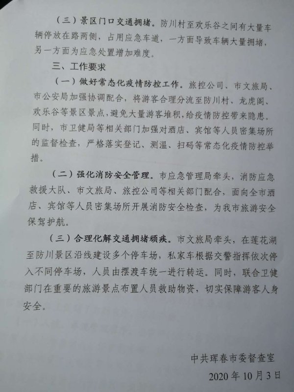 关于市委督察室《关于“十一“期间我市旅游安全情况的通报》(〔2020〕第5期)文件要求,你景区认真组织抓好落实。