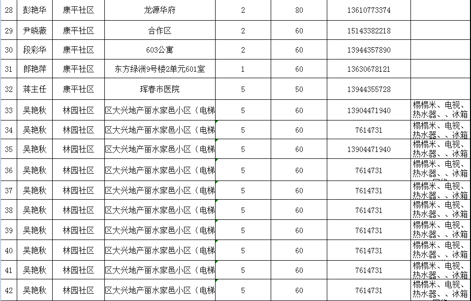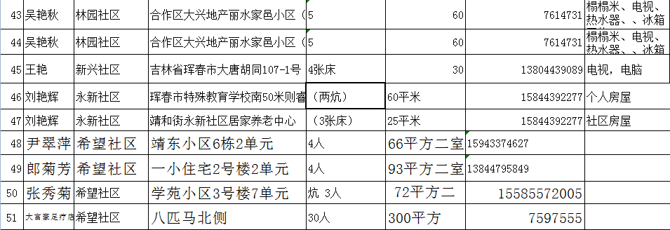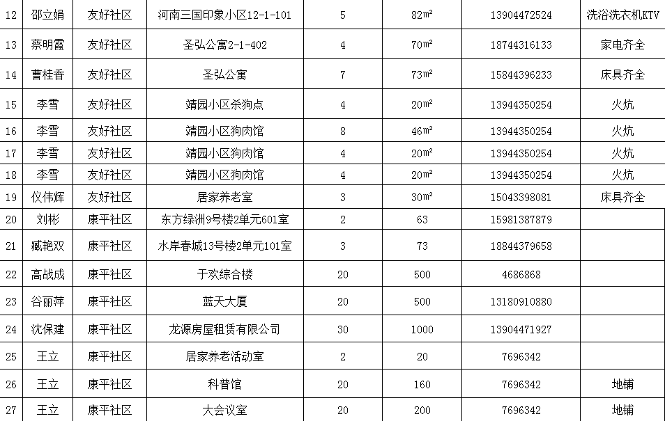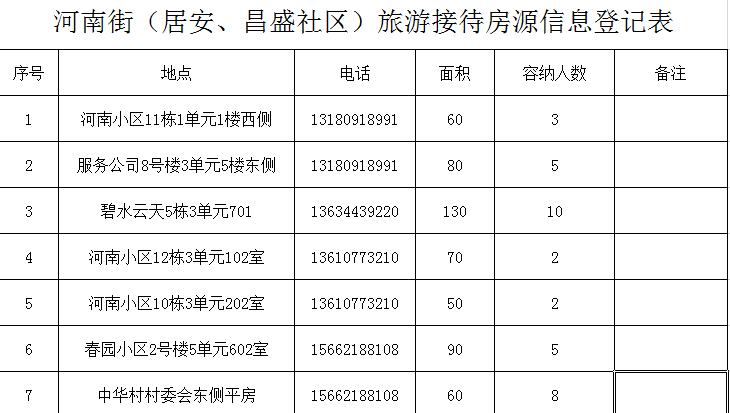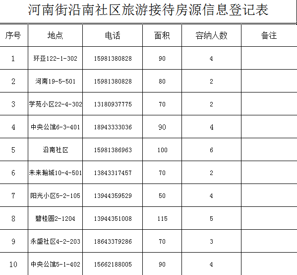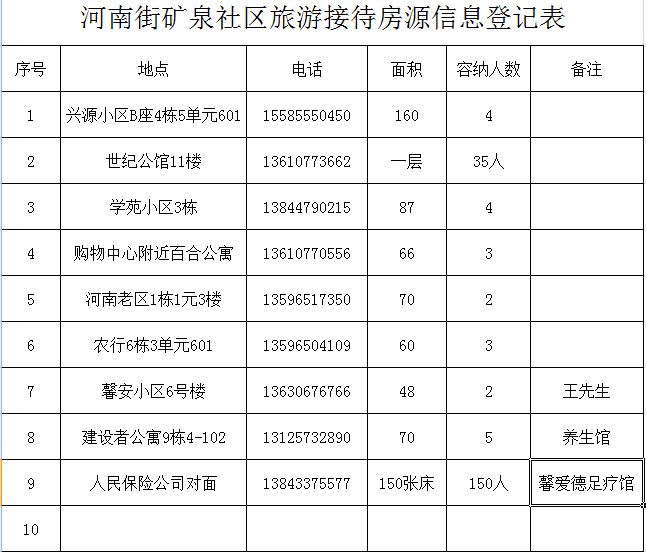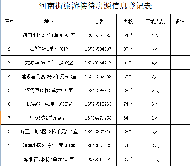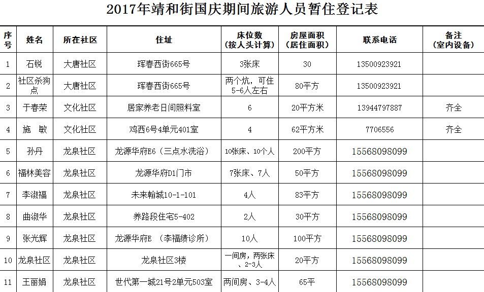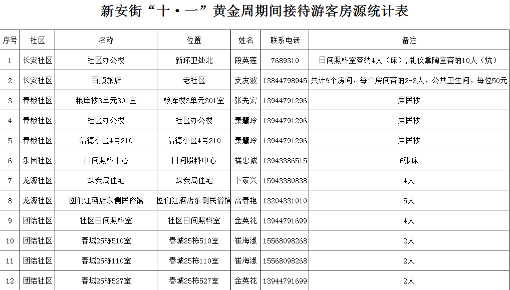 新安街 靖和街 河南街 “十·一”黄金周期间接待游客房源统计表