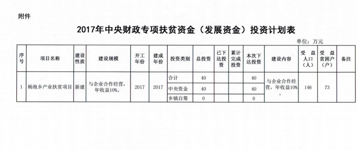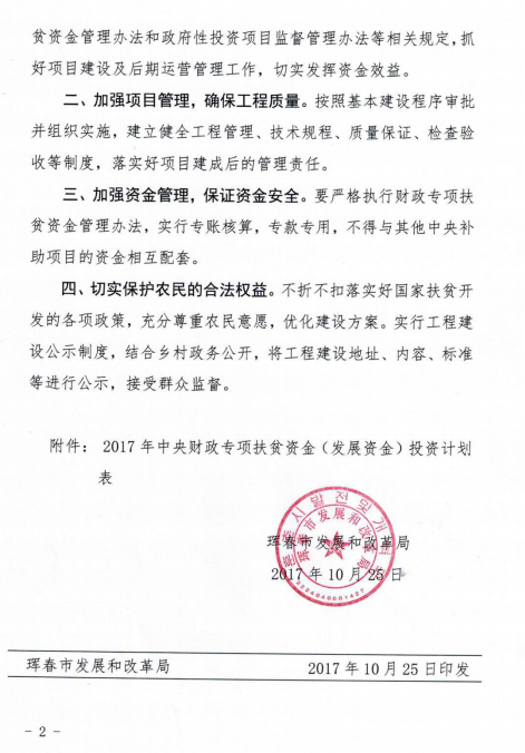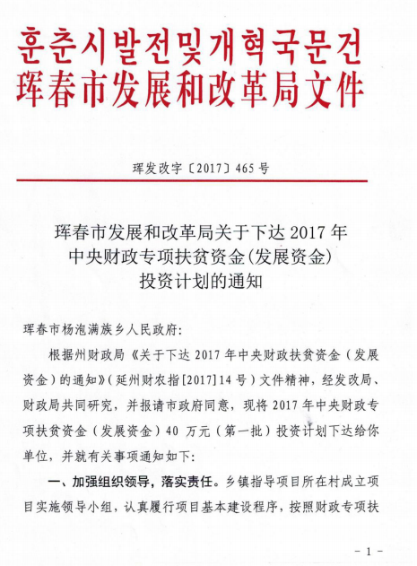 珲春市发展和改革局关于下达2017年中央财政专项扶贫资金(发展资金)投资计划的通知