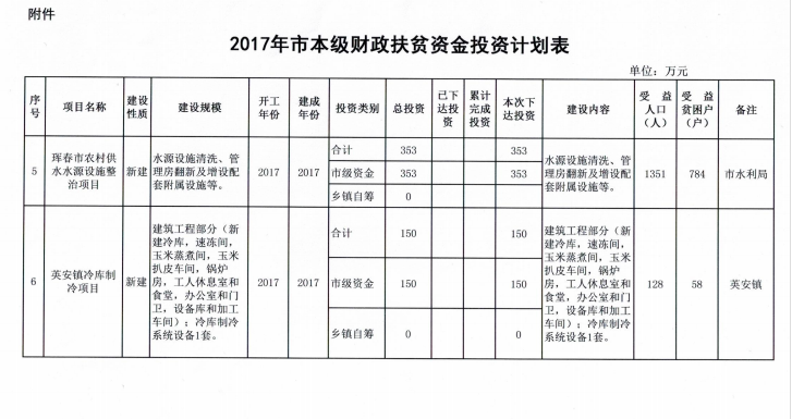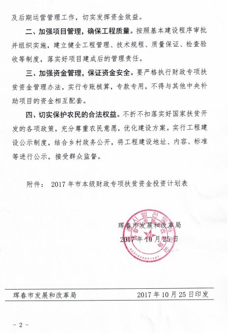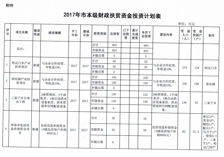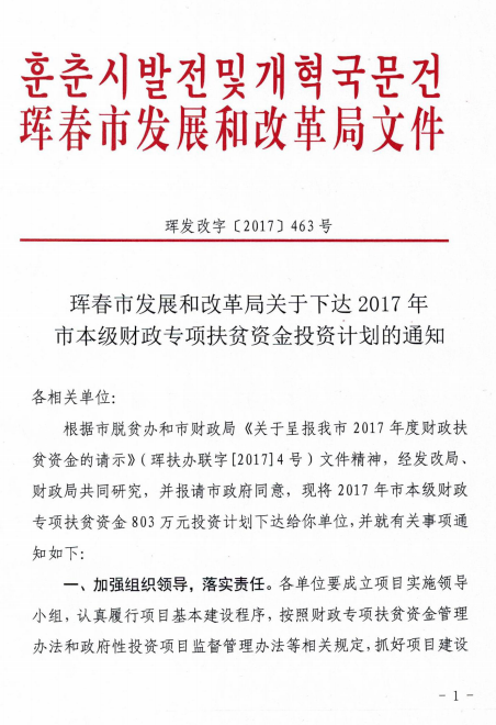珲春市发展和改革局关于下达2017年市本级财政专项扶贫资金投资计划的通知