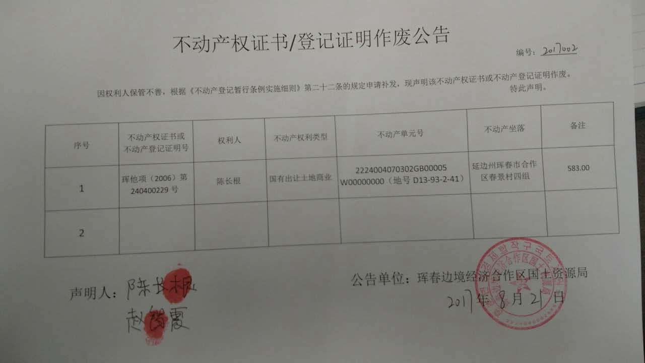 珲春边境经济合作区国土资源局需公开的不动产权证书/登记证明作废公告